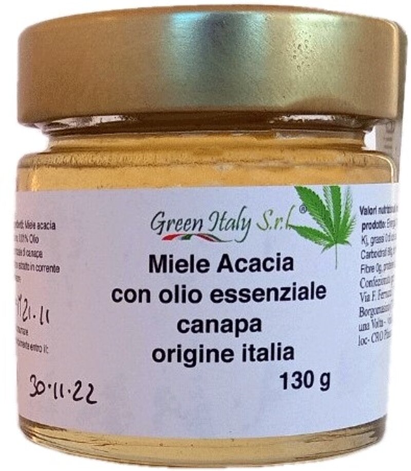 Miele di Acacia con l`aggiunta di olio essenziale di canapa, prodotto artigianale italiano.